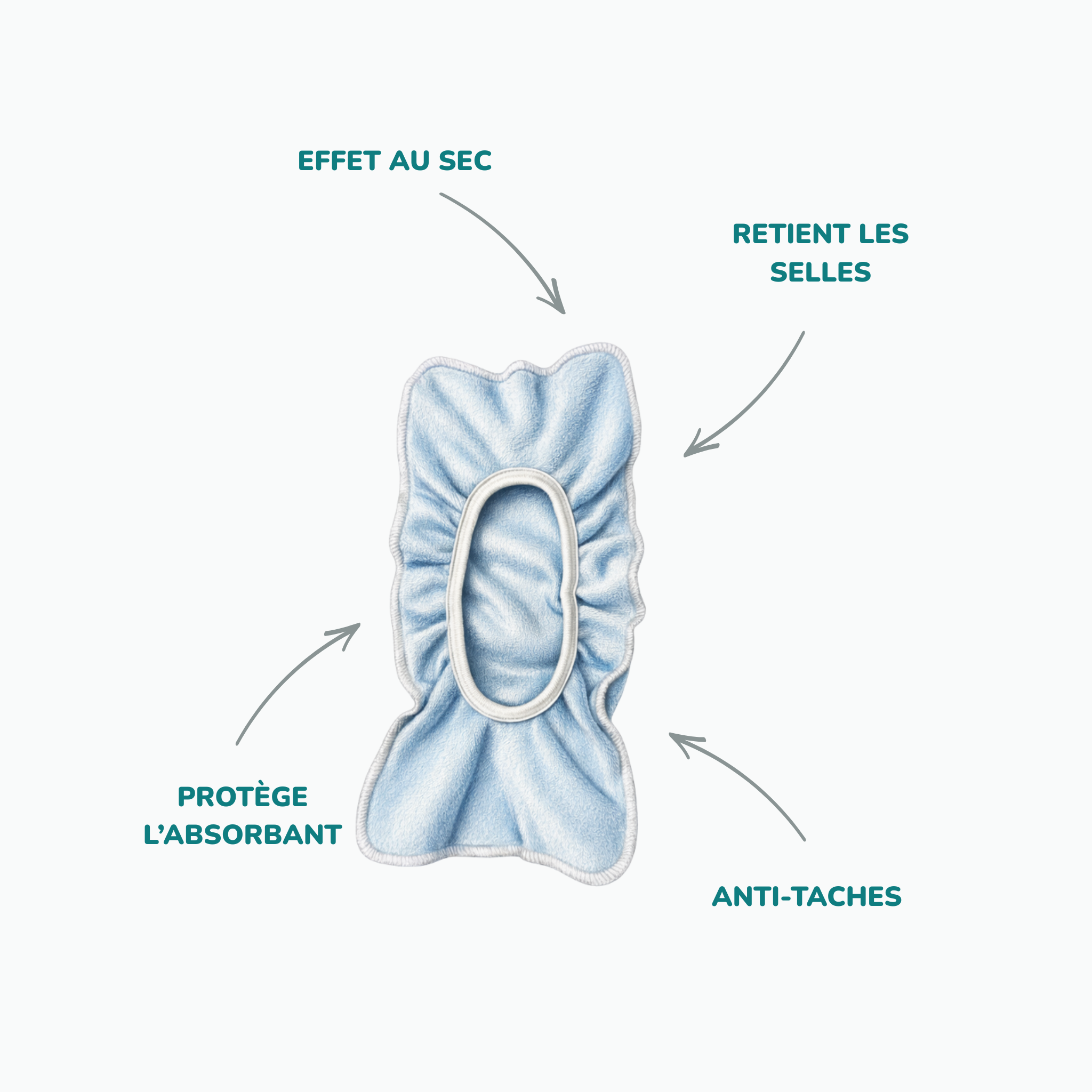 Un voile lavable en suédine technique, conçu pour protéger les inserts, retenir les selles et simplifier chaque change.